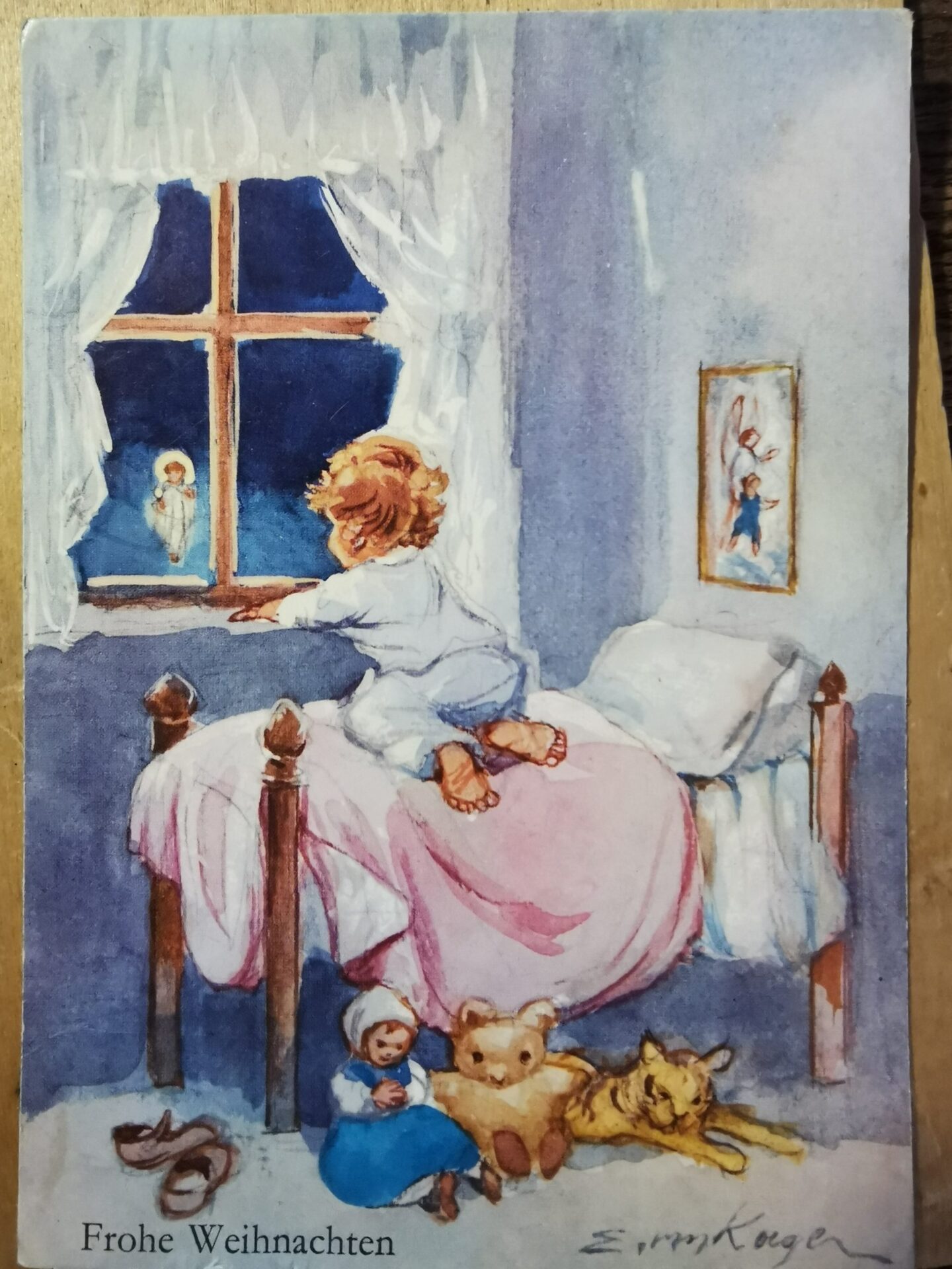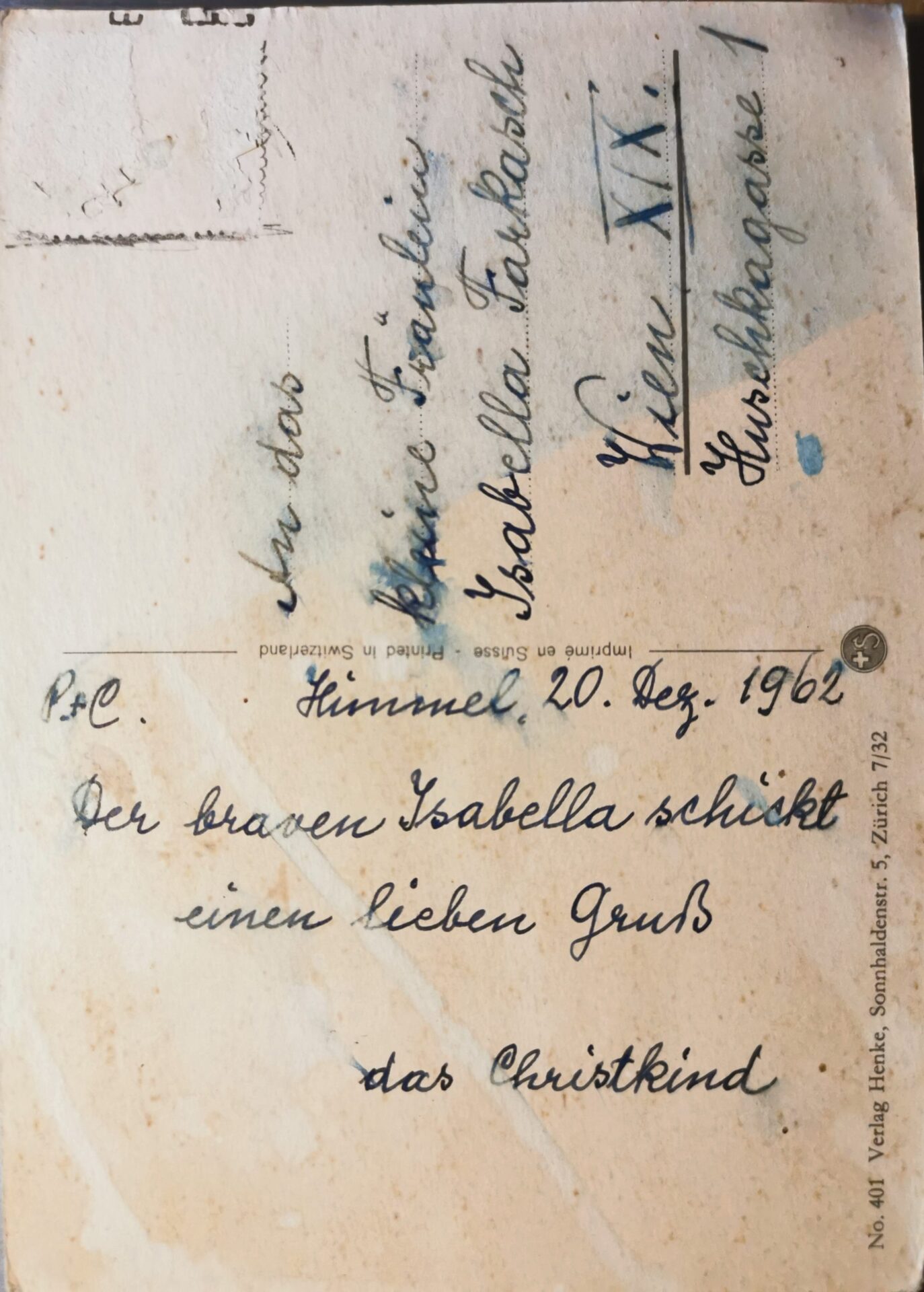 „Meine Eltern achteten streng darauf, dass ich nicht das Geringste erspähen konnte. Wie überwältigt war ich deshalb, als ich an der Stelle, an der ich meinen Brief ans Christkind am Vortrag respektvoll ins Fenster gestellt hatte – es waren Kastenfenster, zwischen den Fensterflügeln war Rau, in dem sich die heilige Zauberwelt ausbreiten konnte – eine Postkarte entdeckte.